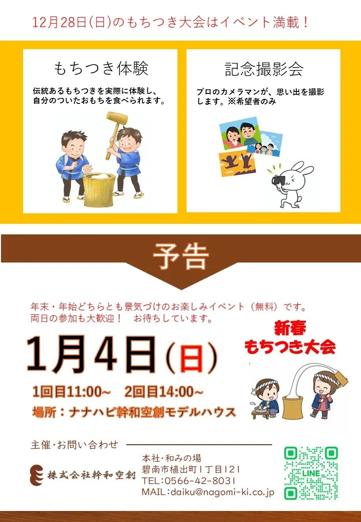 年末もちつき大会開催いたします 2025/12/26 みなさまの笑顔に会いたくてもちつき大会開催いたします!!当日10時より「和みの市」も開催いたします。 つきたてお餅はその場で ずんだ餅 あんこ餅 きなこ餅 あなたは何餅派?? お知らせ